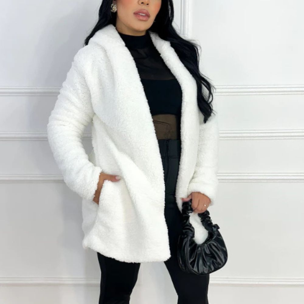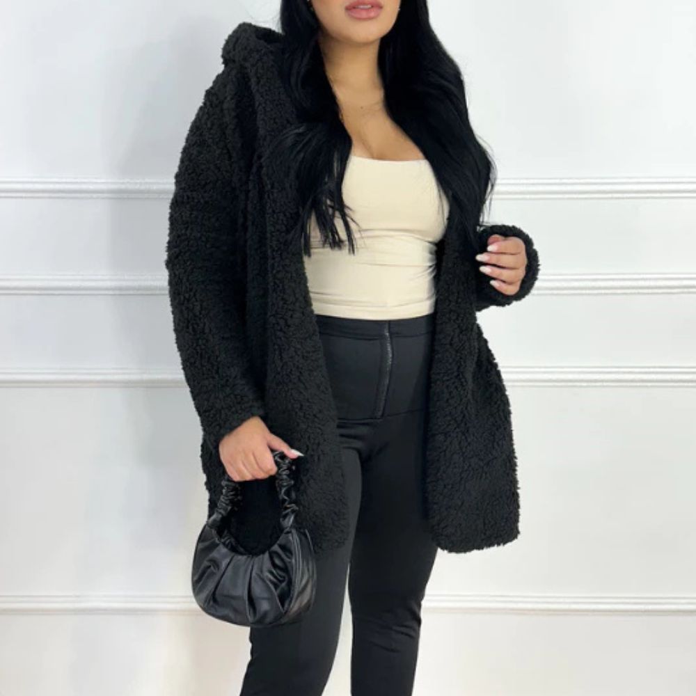 Der lange Damen-Teddymantel mit Kapuze und Fleecefutter ist ideal für alle, die den Winter stilvoll und komfortabel genießen möchten.